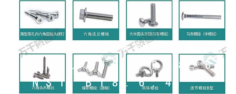1.機螺釘 2.自攻螺釘 3.鉆尾螺釘 4.墻板釘 5.纖維板釘 6.木螺釘7.六角木螺釘 8.不脫出螺釘 9.組合螺釘 10.微型螺釘 11.家具螺釘 12.電子螺釘 13.鏈帶螺釘頭型 :1.六角頭(hexagon head)2.六角頭法蘭面(hexagon head with flange)3.方頭(square head)4.T形頭T head (hammer head5.